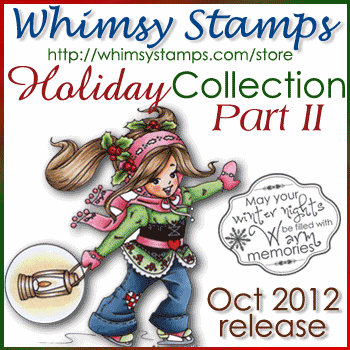 For my card I used the absolutely darling little NEW Apple Blossom's Skates by Elisabeth Bell for Whimsy Stamps. She was stamped on X-Press It and colored with Copics and Flexmarkers, adding Prisma Glitter for the lamp glow and StarDust Stickles to the ice. And can you believe it??? I did not use ribbon or flowers!!! The DP is from the EP Winter Park Collection and the base and double matting are Bazzill. The image is resting on 2 large glitter snowflake ornaments and topped with 2 smaller snowflake ornaments with holly leaves and red rhinestones. I also used the rhinestones to soften all of the corners.